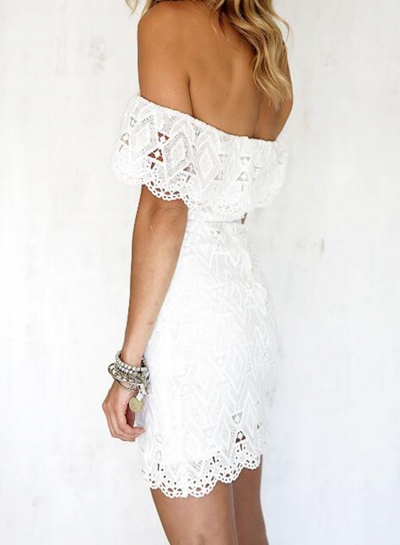 The lace dress is featuring slash neck, off shoulder, flounce design and bodycon fit.
