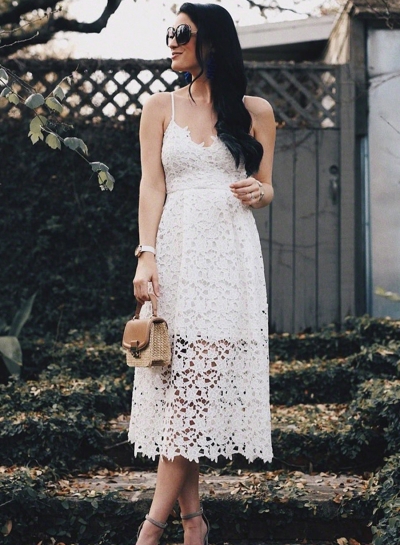 Summer Sexy Boho Solid Lace High Waist Spaghetti Strap V Neck Dress