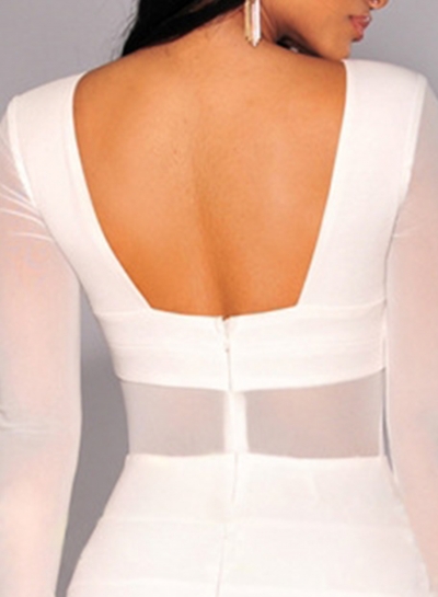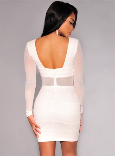 The dress is featuring round neck, long sleeve, mesh panel, solid color and knee length.