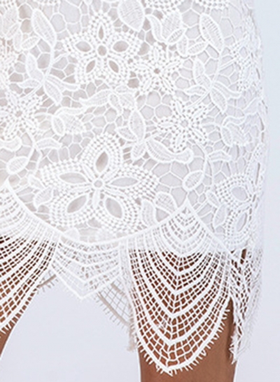The bodycon dress has lace and round neck.