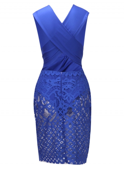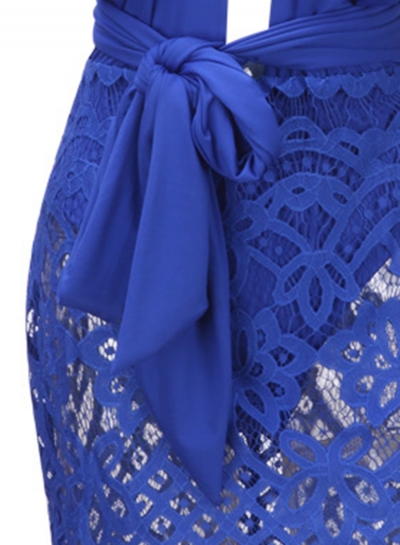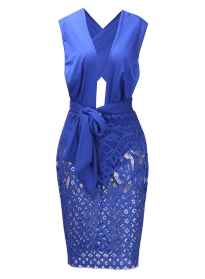 Fashion Sexy Lace Splicing Sleeveless V Neck Waist Tie Bodycon Dress