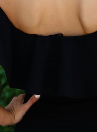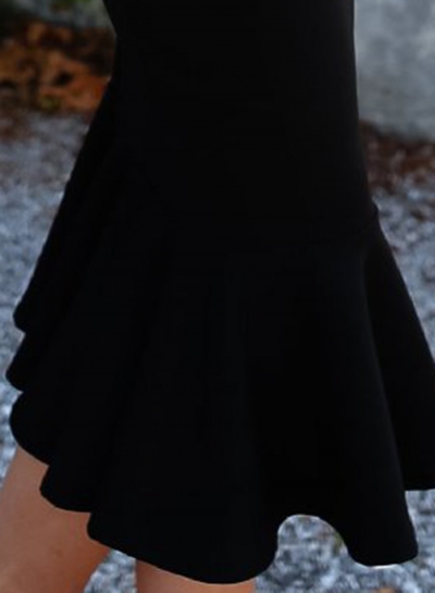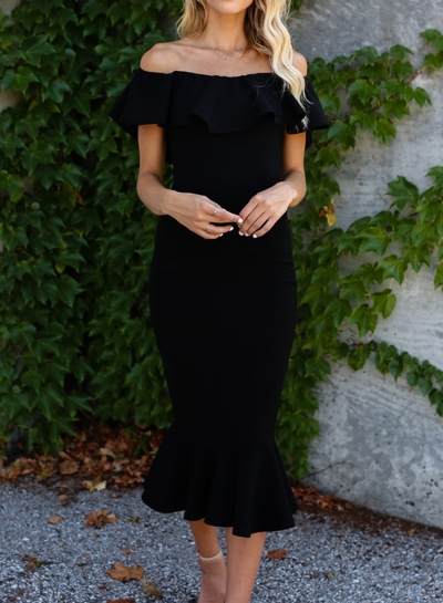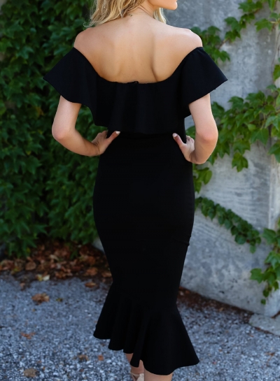 Black Off The Shoulder Ruffle Neckline Solid Color Fiashtail Bodycon Dress
