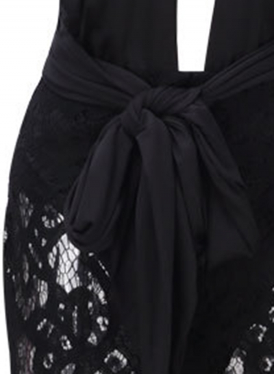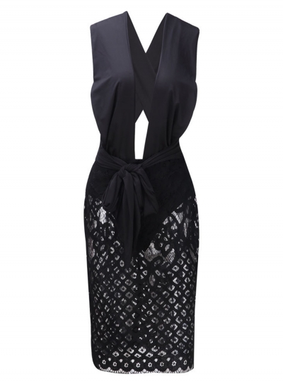 • Black Fashion Sexy Lace Splicing Sleeveless V Neck Waist Tie Bodycon Dress
