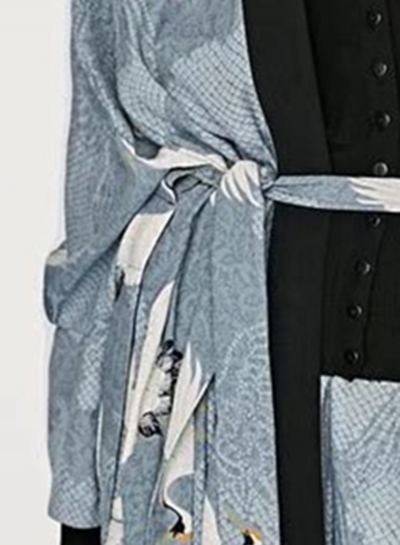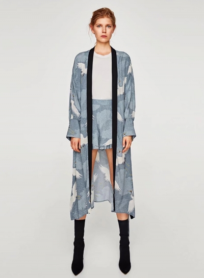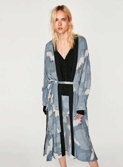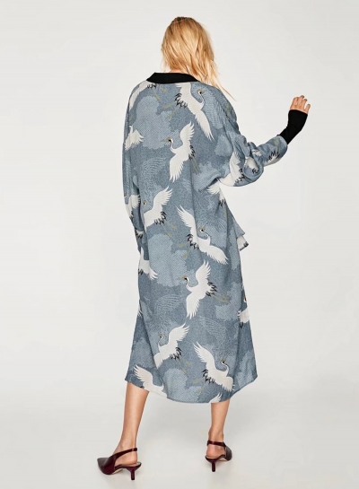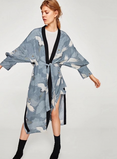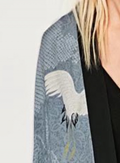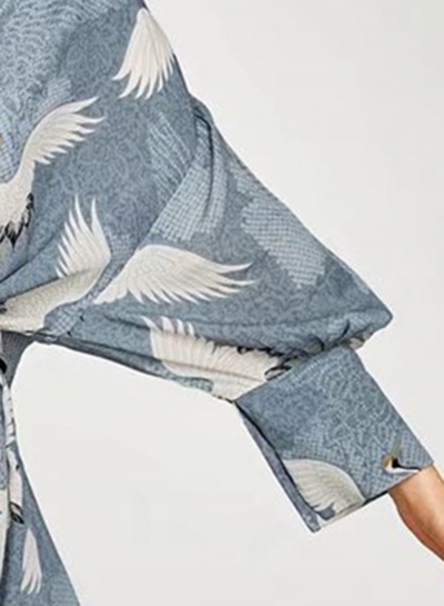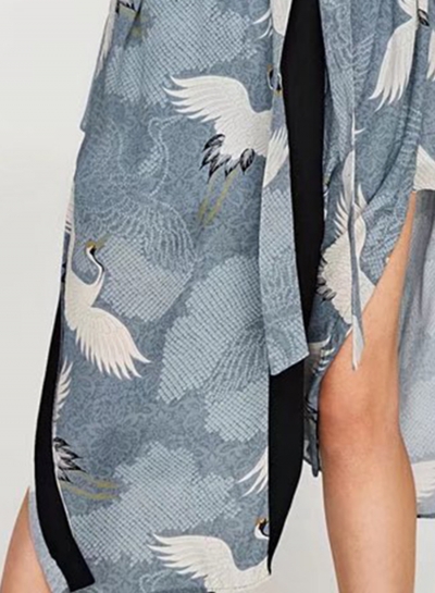 Women's Crane Print Long Sleeve Slit Kimono
