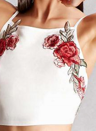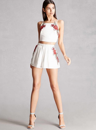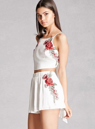Women's Fashion Floral Embroidery Spaghetti Strap Crop Top and Shorts Set