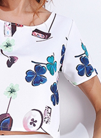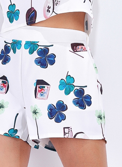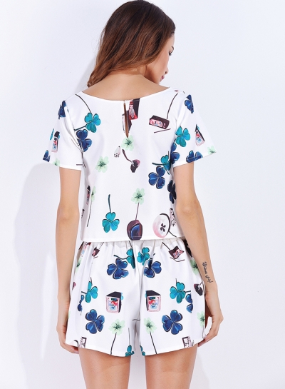 The crop top is featuring round neck, floral print and short sleeve. The shorts is featuring floral print and two pockets front.