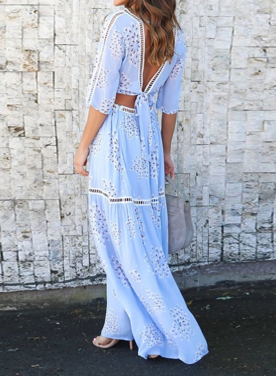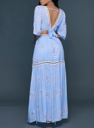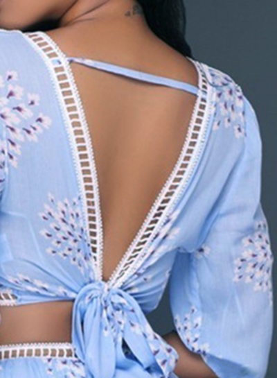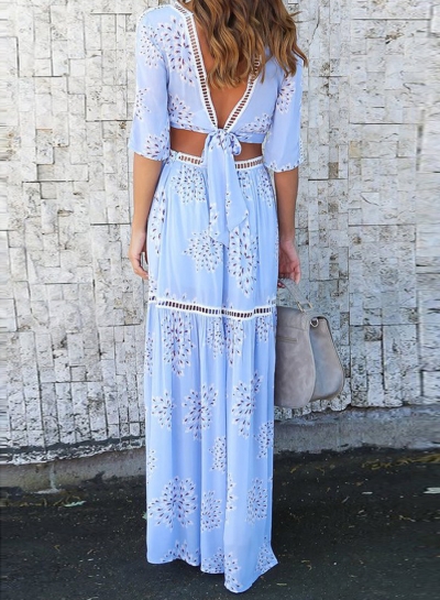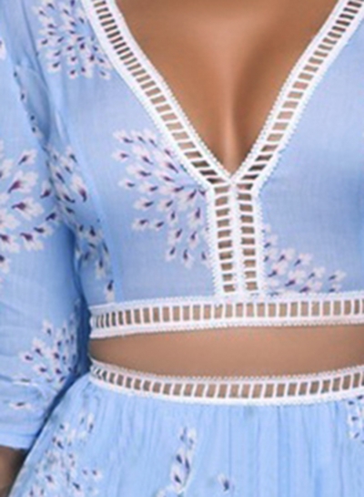 The light blue color two piece set is featuring v neck, half sleeve, lace up, floral print, high waist, hollow out.