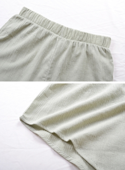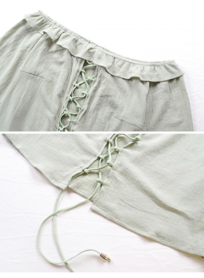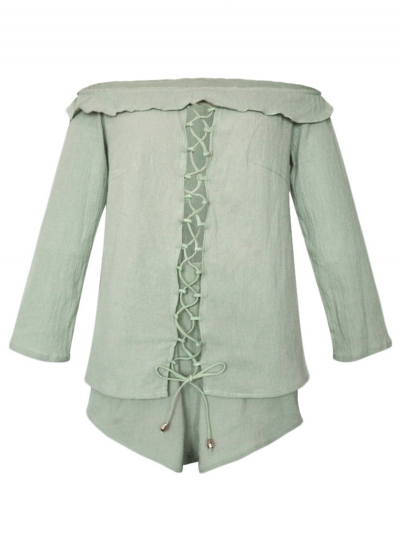 The top is featuring off the shoulder, long sleeve, solid color and lace-up decoration. The shorts feature high waist, solid color and loose fit.