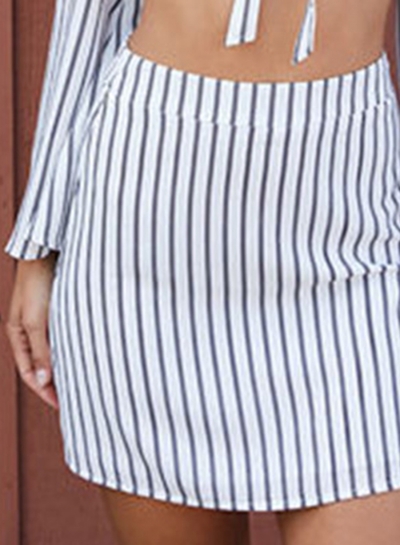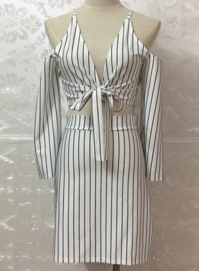 The top is featuring spaghetti strap, off the shoulder, long sleeve, bow front and striped printed. The skirt is featuring high waist, zip closure and mini length.