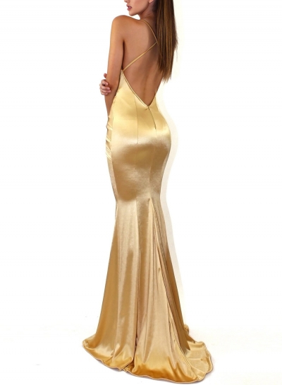 Gold Fashion Sexy Solid Spaghetti Strap V Neck Backless Evening Party Dress